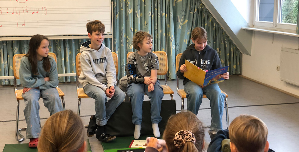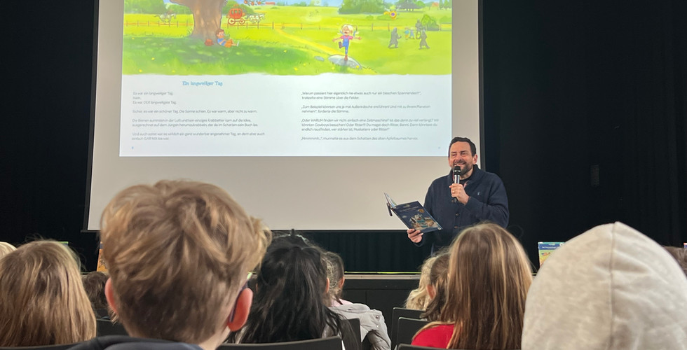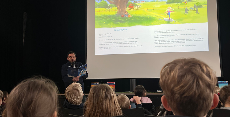 Immer zum Halbjahreswechsel führen wir einen Vorlesetag für alle Klassen durch. Dabei lesen die Viertklässler ihren Patenkindern aus dem ersten Schuljahr vor. Die Drittklässler dürfen aus verschiedenen Vorleseangeboten nach Interesse ein Buch auswählen, welches sie in der Kleingruppe vorgelesen bekommen. Und für unsere Zweitklässler gibt es immer eine Autorenlesung. Dafür kamen zur unserer Freude nun bereits im zweiten Jahr die Weltenbummlerkids . Ben las aus dem ersten Buch - dem Deutschlandbuch - vor. Mit BOB reisen die Kinder in verschiedene Länder und lernen somit die Besonderheiten und alltäglichen Dinge des Landes kennen.